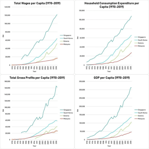 In the charts above, we can see how Singapore’s per capita household consumption expenditure, profits and economy have been growing rapidly due in large part to the high growth in wages, and how South Korea and Estonia are also growing rapidly alongside it, while Malaysia remains stagnated.