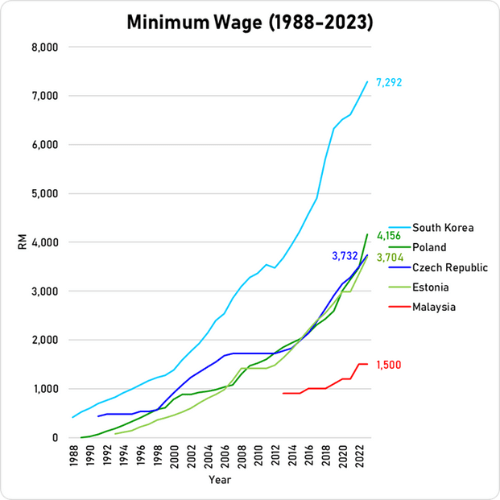 Singapore and South Korea understood this concept and began implementing solutions early in the 1970s by increasing minimum wage structure progressively over the last couple of decades. The data from other countries denote that raising the minimum wage faster could have had net positive effects to Malaysia’s economy. Workers then earn enough for the cost of living in the country, and their higher wage earnings will help push up domestic consumption, which in turn grows the profits of domestic businesses and Malaysia’s economy.
