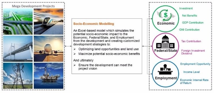 Socio-Economic Models (SEM) have come in as a handy tool to forecast the potential socio-economic impact that could be derived from built asset projects. Traditionally, financial forecasts have been used for development projects to inform the developer on the financial obligations and potential revenues so they are aware of the risks associated with the project. This is even more crucial for the development of mega projects as it usually involves billions of investment and tens of thousands of workforce. Socio-Economic Model (SEM) go one step further than traditional development project financial models, aimed to depict and quantify the potential benefits that could be generated to Governments (local, districts, State and Federal) and the people, on top of the revenue for the investor cum developer cum promoter. Such projections can provide a better picture in terms of the overall benefits that could be delivered by the project.