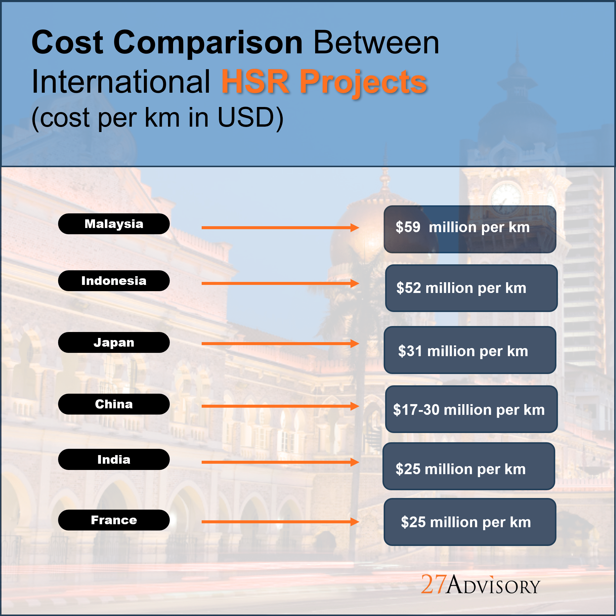 In 2020, the cost for the HSR project was estimated at RM 72 billion, an amount that is 40-50% higher that the industry average when compared to the High-Speed Rail Projects in countries such as Europe and China. According a European Union audit on HSRs in the region, the KL-Singapore HSR should have cost approximately RM42 billion. Similarly, a 2019 World Bank Report on HSRs in China indicates that the maximum cost for KL-Singapore HSR should have RM 33 billion. Thus, there are inherent concerns with regards to the optimised appropriation of finances for the project. However, these should be weighed in reasonably with consideration of the unique financial factors impacting the KLHSR project, such as the cost of materials, services and other resources within the KL and Singapore regions.